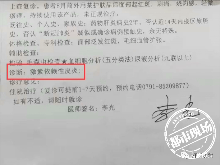 1月14号,陈女士脸上的问题,在江西省皮肤病专科医院诊断为“激素依赖性皮炎”。在拿到这个诊断结果后,陈女士懊悔不已,“花了10多万,却把自己的脸搞烂掉了。”